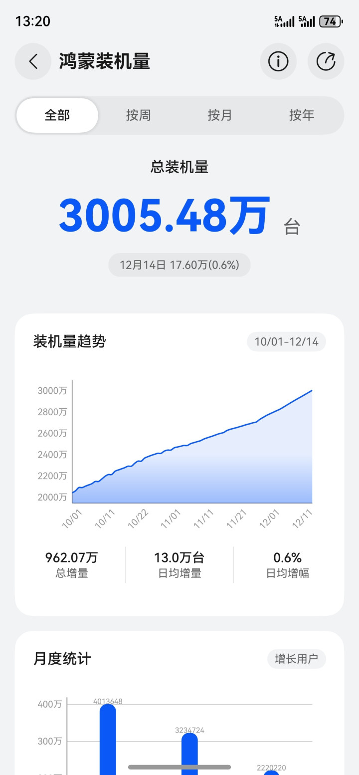 “AIMIKKKK”晒出的图片显示,2025年10月1日-12月14日,鸿蒙系统总增量为962.07万台,日均增量为13万台,日均增幅为0.6%,展现了极强的成长性。
